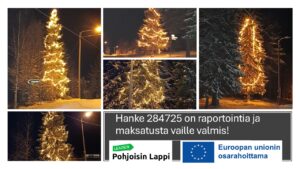 Hanke 284725 on päättymässä, hankkeen viimeinen toimenpide oli laittaa jouluvalot kylän upeisiin luonnonkuusiin, joista viisi sai valaistuksen. Seuraavaksi kirjoitetaan hankkeen loppuraportti ja haetaan maksatus. Kiitokset hankerahoituksesta Leader Pohjoisin Lappi ry:lle, Sodankylän kunnalle väliaikaisrahoituksesta ja Kieringin Kehitys ry:n sekä Pidä Lappi Siistinä ry:n tomerille talkoolaisille.